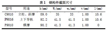 文獻[7]進行了冷彎薄壁型鋼墻體實驗與整體實驗。實驗試件為10片1:1雙面覆板(OSB板+石膏板),立柱及斜撐桿均為C型鋼,型號為C9010,上下導軌及剛性橫撐為冷彎槽鋼,導軌型號為P9016,橫撐型號P9010.石膏板厚度為10mm,寬×高為1.2m×3m;OSB板厚度為12mm,寬×高為1.22m×2.4m。自攻螺釘連接,鋼構件截面形式尺寸如圖1和表1。