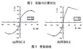 由荷載位移曲線可得墻體的骨架曲線。WSC-1、WDO-1實驗與模擬如圖3。