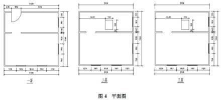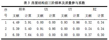 整體模型平面尺寸設計為5.1m×5.1m,設兩個開間,模型平面圖為4,層高3m 共三層,立面圖與荷載參見文獻[7]。運用上述墻體模型建立三層冷彎薄壁型鋼整體房屋。得到結構的前3階頻率及質量參與系數如圖5,與文獻[7]對比如表3。