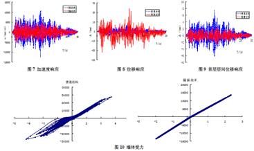 由圖10可以得到:普通結構首層墻體在8度罕遇地震下底層墻體已進入了塑形階段,而隔振結構依舊處于彈性階段。隔振結構的主體結構構件受力小于普通結構,這保證了結構的安全。
