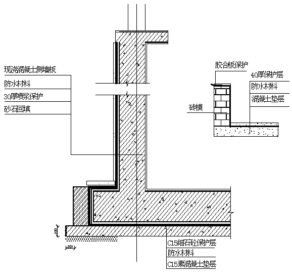 6)地下室底板邊側收尾在完成底板防水層施工時必須預留30cm防水卷材,見圖4所示,地梁底施工節點見圖5所示。