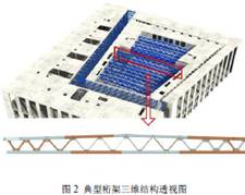 本工程鋼結(jié)構(gòu)總量約1.4萬噸,主要分布在A1區(qū)祈禱廳和A2庭院,B區(qū)宣禮塔、C區(qū)廣場(chǎng)以及D區(qū)文化中心。D區(qū)文化中心主要為屋面鋼桁架結(jié)構(gòu)。主要由H型上弦桿、H型下弦桿、雙槽鋼腹桿、節(jié)點(diǎn)板、連接板、加勁板、槽鋼等組成。典型桁架最大跨度約38m,重量約為19t。見圖2。