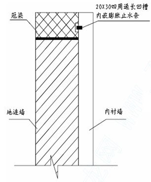 2)在地連墻上口的冠梁與內襯墻的接觸面上鑿一條四周通長20×30的凹槽,在槽內嵌遇水膨脹止水條(圖4),以增加冠梁與內襯墻接觸面的防水效果。