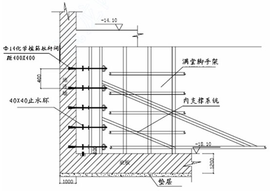 3)為確保內襯墻混凝土的成形質量,對內襯墻模板的加固拉桿采取在地連墻上預植 14@400×400 鋼筋的形式,并在拉桿鋼筋中間加焊40×40 止水環,以確保成形混凝土不從拉桿處滲水(如圖5)。同時,內襯墻的支撐腳手架采取搭設滿堂腳手架的形式。對D坑兩電梯井鋼筋采用14@1000×450