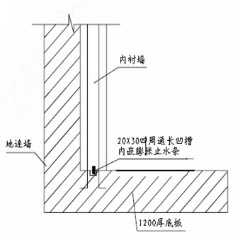 1)在內襯墻與底板的接觸面中間鑿一條四周通長20×30 的凹槽,在槽內嵌遇水膨脹止水條(圖3),以增加內襯墻與底板接觸面的防水效果。