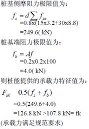 (2)分析認(rèn)為:采用短樁進(jìn)行淺基礎(chǔ)加固,讓樁端位于第④層土淤泥質(zhì)粘土,比第⑥層粉砂土,樁端土體更易破壞,從而樁與淺基礎(chǔ)下的土體共同載上部荷載。同時(shí)要保證強(qiáng)度驗(yàn)算要求。這樣做經(jīng)濟(jì)又安全。