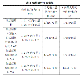 由表3可以分析,在加層之后,發(fā)生最大層間位移的樓層實際上移(由2層轉(zhuǎn)至3層),由于本工程實際減少了二層(原屋面)的荷載,因此二層的層間位移有所減少。原結(jié)構(gòu)的變形曲線為明顯的剪切型變形,下部層間變形大,向上逐漸減小;而加層之后,由于二層間位移的減小,三層層間位移的增大,結(jié)構(gòu)變形曲線趨向均勻的線性。
