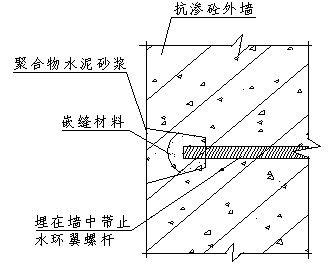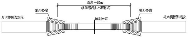 ④地下室外墻穿大模板螺栓需要具備止水功能,施工中使用特制穿墻螺栓,埋在墻內段滿焊止水鋼板,拆外墻模板時將套筒及外側拉桿拆除后周轉使用。如下圖所示。外墻螺栓套帽拆除后使用嵌縫材料和聚合物砂漿將外墻內外側凹陷部位補平。詳細構造見圖8、9。