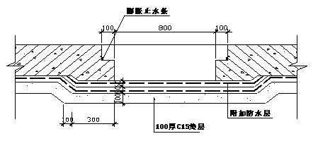 b.后澆帶附加層。本工程后澆帶寬為800mm,后澆帶位置處的附加層是在防水層大面積施工完畢后才開(kāi)始鋪貼的,附加層寬為兩邊各出300mm。如下圖2所示。