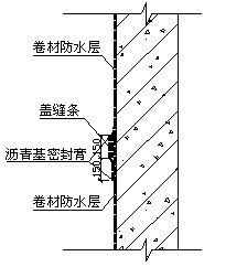 2)卷材施工方法:將基層表面清理干凈,經(jīng)過(guò)驗(yàn)收后,然后涂刷基層處理劑,鋪貼方向?yàn)樽韵露贤七M(jìn),目的是為克服卷材自重引起的速度過(guò)快。先鋪貼大面積然后處理節(jié)點(diǎn)部位。地下室外墻卷材防水層的配置如圖5所示。