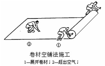 B.鋪貼卷材。本工程墊層上大面積鋪貼均采用空鋪法施工。卷材在平面上的鋪貼方法為展鋪法。即先將卷材卷打開(kāi)展鋪在基層上,然后封邊的鋪貼方法。具體如下:沿著基準(zhǔn)線,將卷材包裝打開(kāi),一端固定,展開(kāi)鋪貼在基層上,并用小圓輥或者小平板刮卷材表面,以趕出空氣,使卷材與基層粘貼密實(shí)(如圖4)。展鋪時(shí)要注意卷材的搭接寬度不小于100mm。