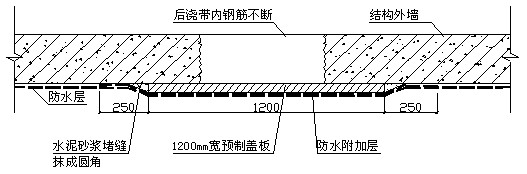 6)外墻后澆帶的防水施工。地下結(jié)構(gòu)外墻混凝土完畢后,達(dá)到外墻防水施工條件,后澆帶位置外側(cè)蓋1200mm寬預(yù)制蓋板,用水泥砂漿堵縫并抹成圓角,表面清理干凈,附加層和防水層都粘貼在預(yù)制蓋板的外側(cè),如圖8所示。