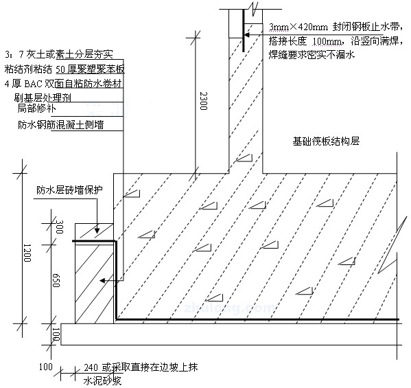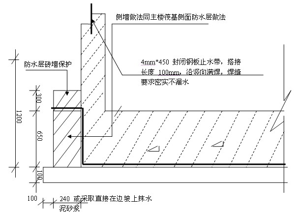 b.在水平施工縫處增設500mm寬水平卷材加強層。
