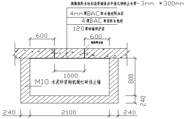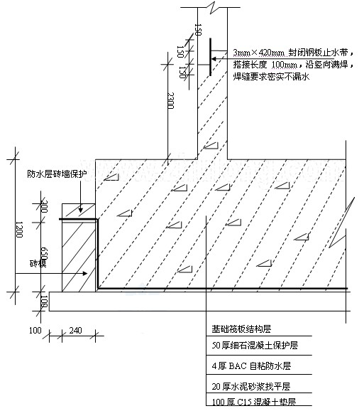 建筑物基礎底板墊層施工后,按施工圖放出保護墻位置線。按要求砌筑保護墻650mm高。為使墻面防水卷材接槎,以滿足底板防水與墻體防水的搭接寬度。