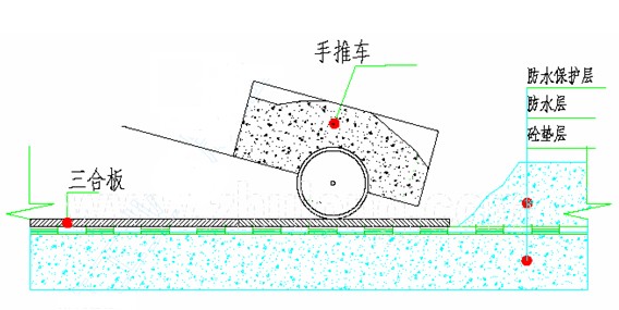 (3)卷材防水層的基礎底板保護層施工時,搭設混凝土泵管架的支腿下應用腳手板鋪墊,卷材上不得推小推車,防止小車支腿刮破防水卷材或小車在推拉過程中,車輪碾壓到石子刮破卷材。