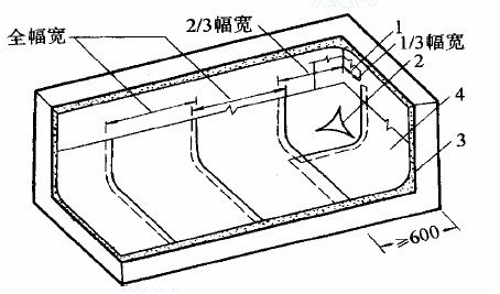 7)陰陽轉角部位防水處理如圖1~圖4所示。轉角部位,包括陽角、陰角及三面角,是防水層薄弱部位,應加強防水處理。轉角部位找平層應做成圓弧形。