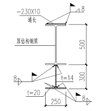 鋼梁GL1采用加大原結構構件截面的方法進行加固,在鋼梁下翼緣增焊倒置的“T”形型鋼,上翼緣貼焊10mm厚鋼板的方式增大截面面積和截面模量,以提高構件承載力,如圖6。重新計算構件截面特性,并考慮加固強度的折減系數,以達到新荷載對構件設計要求,運用結構計算軟件(STS)進行內力分析時,按照力學指標(如截面慣性矩,截面模量,截面面積,截面回轉半徑等)近似相等法則,將新型鋼梁折算成標準型鋼輸入程序,根據程序的計算結果不斷調整型鋼的加固斷面,直到滿足要求。