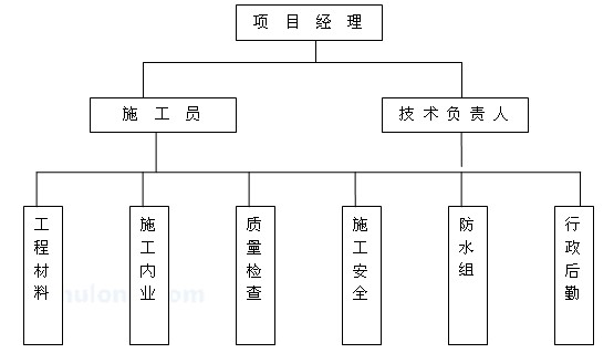 我公司針對此工程的重要性,公司將該工程納入一級目標管理,公司決定委派施工經驗豐富的項目經理及施工管理人員進行該工程的施工。項目部在公司的統一管理下完善各項管理制度,嚴格按照項目法進行本工程的施工和管理。項目經理部的成員相互間配合默契,保證在項目經理的直接領導下,做到有計劃地施工和管理,確保工程項目的質量、工期和安全文明施工,達到建設方滿意的效果,體現我公司的水平。施工組織機構如下: