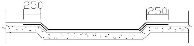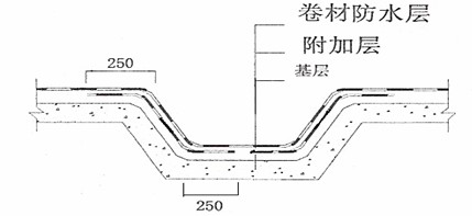 ①陰陽角加強層處理。在基層處理劑干燥后,以陰陽角為中心兩邊寬度均為250mm(此項工作在鋪貼大面積防水前施工如圖1所示)。