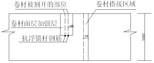 ⑦抗浮錨桿防水處理(圖8、圖9)。先在樁頭與墊層之間涂刷1.2mm厚緩凝型堵漏劑,然后涂刷1:1.5JS涂料1.2mm厚,整體做4mm厚SBS改性瀝青防水卷材,卷材做好后,在卷材與樁頭的收頭處用SBS卷材同性的SBS涂料涂刷密封收頭。防水卷材在抗浮錨桿的鋼筋處選擇短邊將其割開,繞過鋼筋后進行鋪貼,最后在被割開部位的面層上作一道加強層。