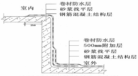 3)地下室頂板與建筑物外墻防水高度應高于頂板覆土物表面500mm,做法與屋面女兒墻防水做法一樣。