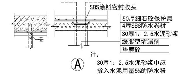 地下室底板、側墻及頂板外露部分防水工程采用Ⅰ型聚脂胎砂面SBS改性瀝青防水卷材(4mm厚),地下室消防水池為水泥基滲透結晶性防水涂料。