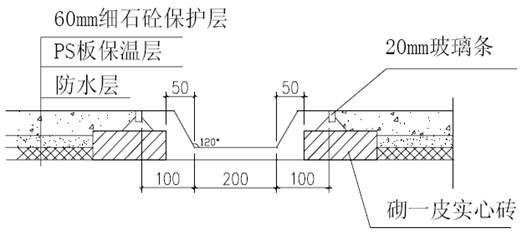防水層施工完成后,立刻根據落水管實際位置拉通線確定水溝位置,確保每個落水管都在水溝內,并應平行于女兒墻,然后彈線,按圖3砌筑一皮實心磚。