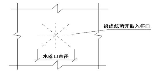 ①水落口。水落口的上口安裝標高,要考慮到天溝的排水坡度、水落口處局部加大的坡度(5%)以及找平層、防水層、附加層和保護層的厚度,標高須準確,不得過高也不得過低。附加層寬度每邊粘貼50mm,剪貼方法如圖1: