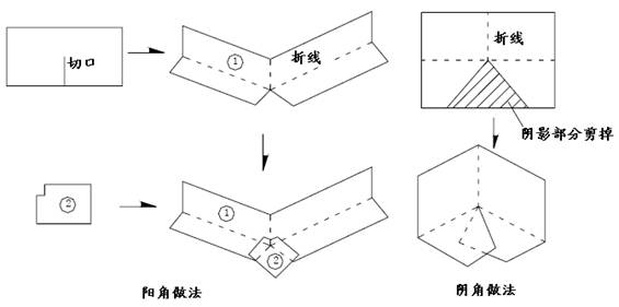 ③陰陽角。防水層的陰陽角應做成圓角,在這些部位加做卷材附加層,每邊粘貼50mm, 剪貼方法如圖2:
