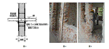 在拆除墻體裝飾層時(shí),由于施工不當(dāng),造成墻體破壞嚴(yán)重,尤其窗間墻小墻肢,如圖4、圖5。發(fā)現(xiàn)此問題后,設(shè)計(jì)要求對(duì)破壞嚴(yán)重墻體采取支模后灌灌漿料進(jìn)行加固。