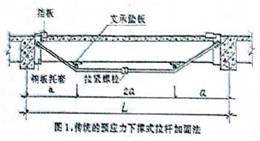 在我國現行混凝土結構加固設計規范[1]中,有一種傳統的體外預應力加固法,分水平拉桿法,下撐式拉桿法和組合式拉桿法三種。這種方法是五十年代從蘇聯傳進來的,由于當時還沒有高強度的鋼材,只能采用低強度的鋼筋作為補強拉桿。其中下撐式預應力拉桿法的做法如下圖所示。