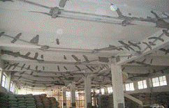 鋼筋砼樓、屋面大梁在砼收縮、室內外溫差和荷載的共同作用之下,往往要在跨中產生豎向裂縫,在兩端產生斜向裂縫。當砼質量較差時,裂縫情況更加嚴重,裂縫寬度經常要超出國家設計規范的要求,需要進行加固處理。采用無粘結鋼絞線體外預應力加固法加固這種已嚴重開裂的樓、屋面大梁最為理想。因為加固以后,大梁的裂縫寬度要變小,而且大梁上始終作用有軸向壓力,可以有效抵抗砼收縮和室內外溫差引起的軸向拉應力,使得裂縫有效地得到控制,一般將裂縫封閉以后將不再出現。