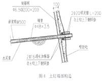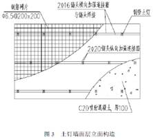 本工程采用1:0.5進行放坡,其中選3-3剖面為例。土釘全部采用鋼管土釘,土釘傾角為150,土釘長度及豎向間距(如圖2所示)。水平間距1000mm,面層混凝土板墻厚度為100mm,強度等級為C20,內配Φ6.5@200鋼筋網,有土釘處沿橫向配置2Φ16同長加強筋(縱向配置2Φ20,L=200mm)。(如圖3所示)