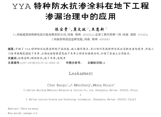 2013年6月,由國(guó)內(nèi)防水專(zhuān)家聯(lián)名撰寫(xiě)的鄭州賽諾建材生產(chǎn)的YYA特種防水抗?jié)B漿料在地下工程中的應(yīng)用的文章在中國(guó)建筑防水雜志上發(fā)表。該文章闡述的地下工程的各種混凝土缺陷,混凝土裂紋,外防水的失敗等各種問(wèn)題發(fā)生后,如何在里面重新建立一道防水系統(tǒng),以及鄭州賽諾的背水一噴靈的原理,施工步驟等。