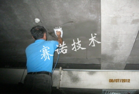 3.12小時后復查,如有局部仍然漏水,可采用YY-16閃凝漿料快速止水處理,再次噴涂背水一噴靈2遍,達到1-2MM厚。